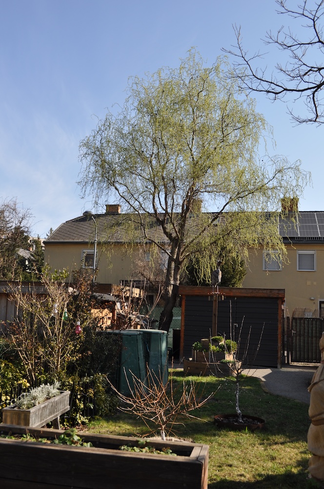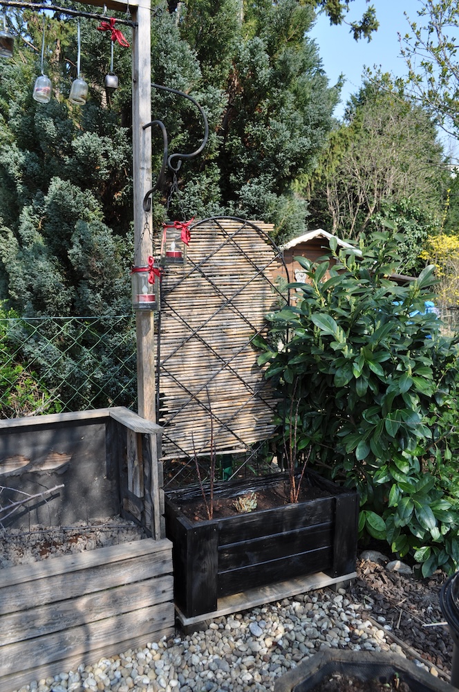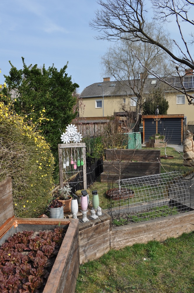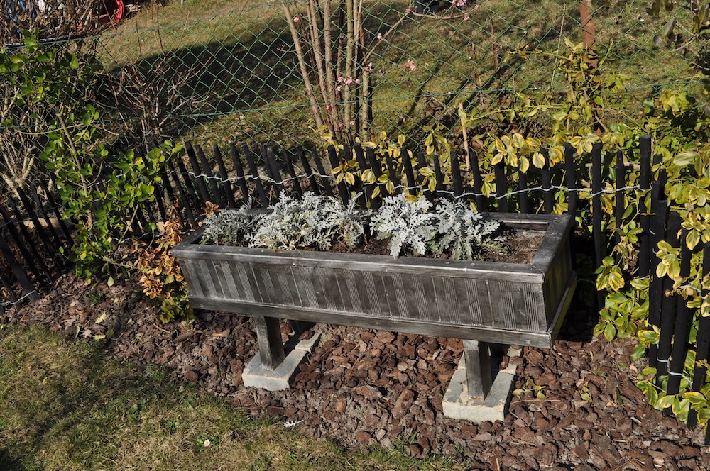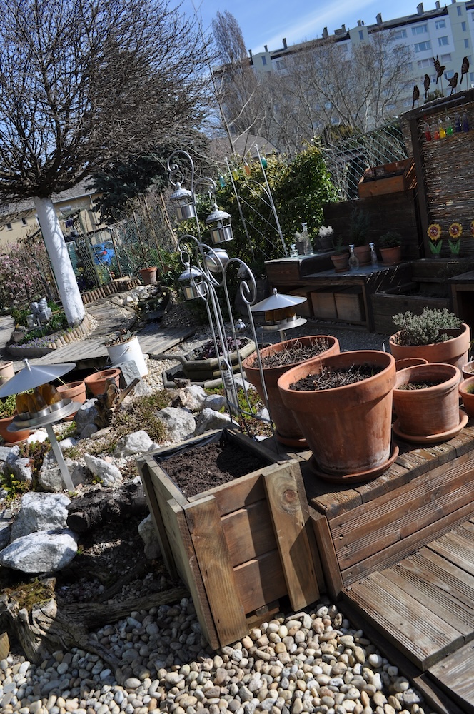 Solange das milde Wetter anhält, werkeln wir weiter im Garten. Das Kisterl beim Flieder haben wir zur Kräutertreppe verbracht und das Oswegokraut rein gepflanzt. Ein neues, breiteres Kistel hat einen dunklen Holzanstrich bekommen und das kleiner Kisterl ersetzt. [Bild Nr. 5/01-5/04]