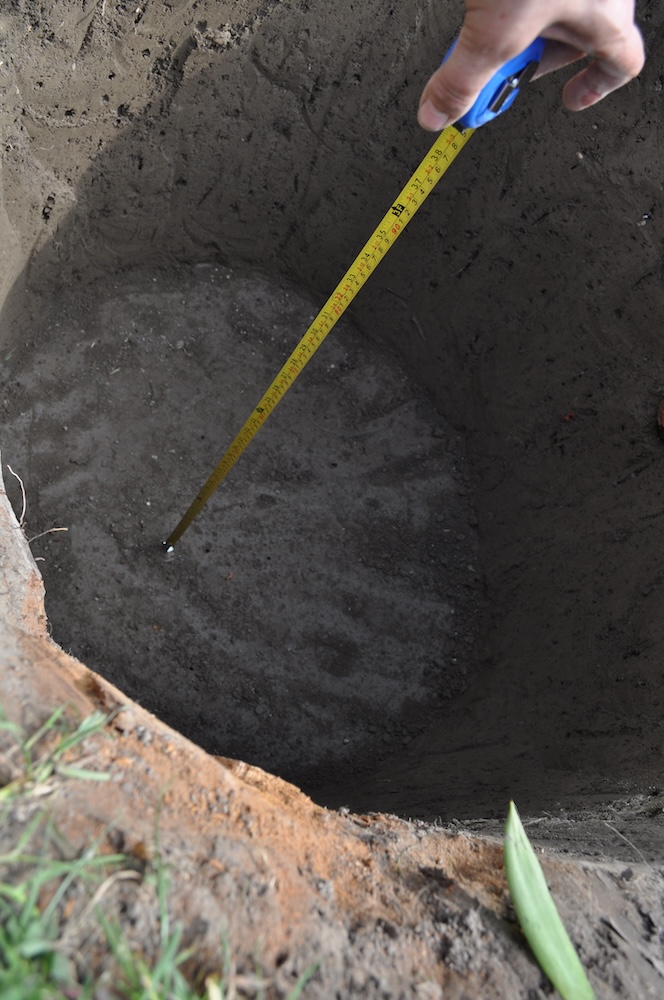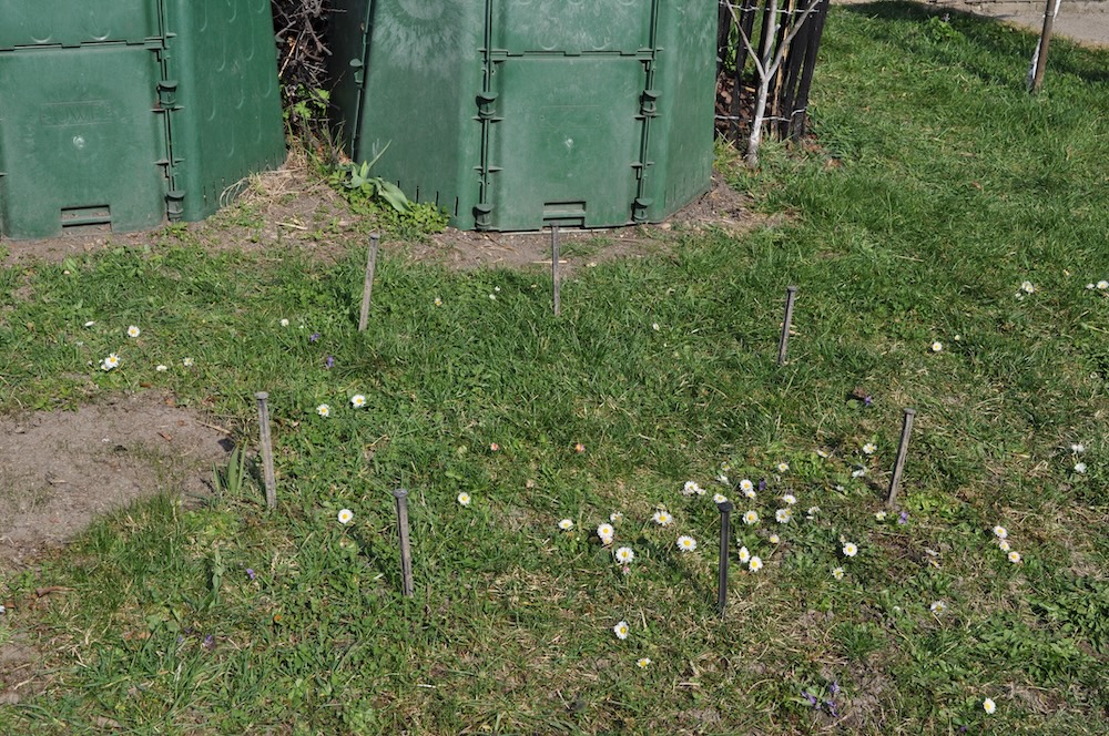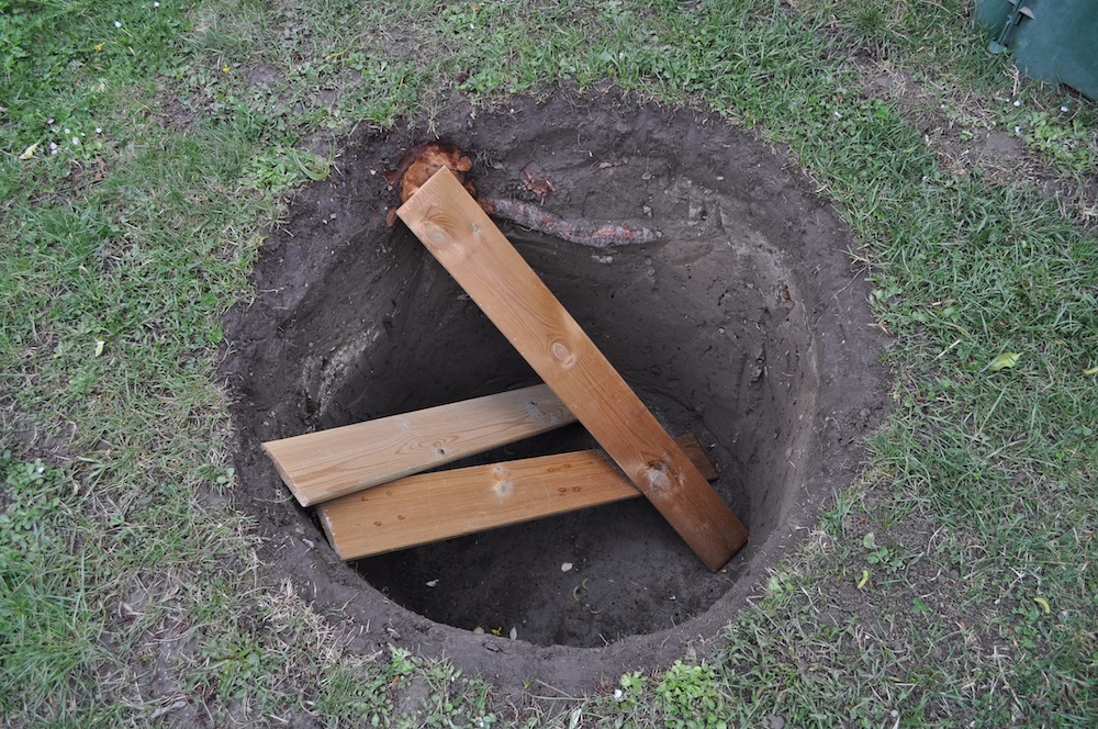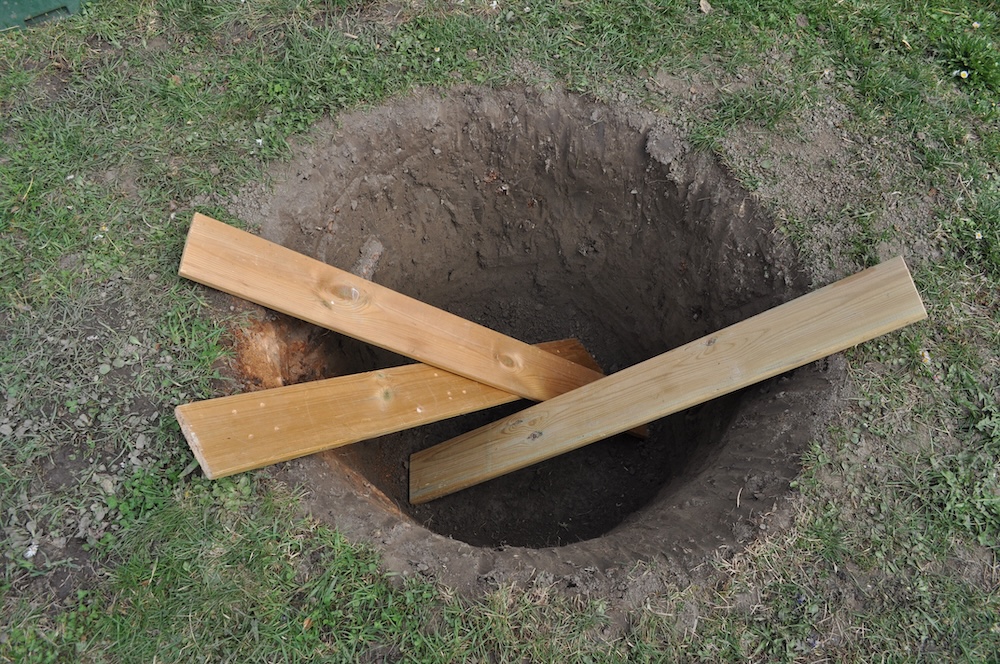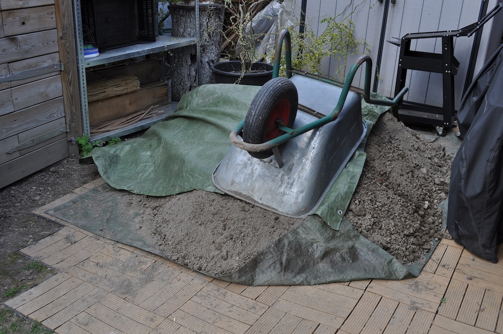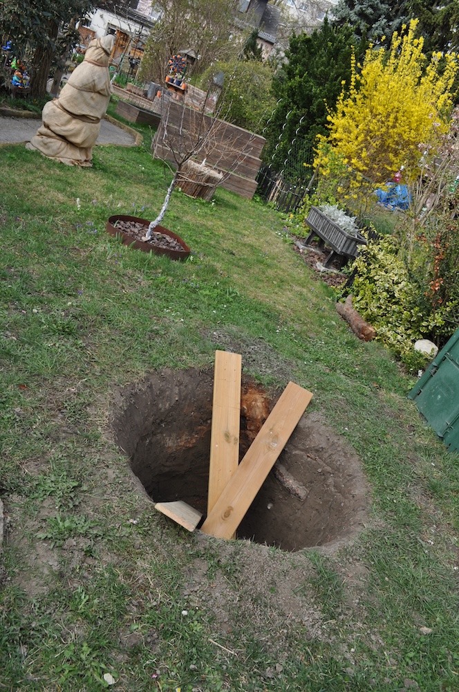 Für den angekündigten, neuen Baum haben wir das Loch ausgehoben und eine Kletterhilfe eingesetzt, sollte ein kleiner Gartenbewohner hineinfallen.  [Bild Nr. 5/15-5/17]