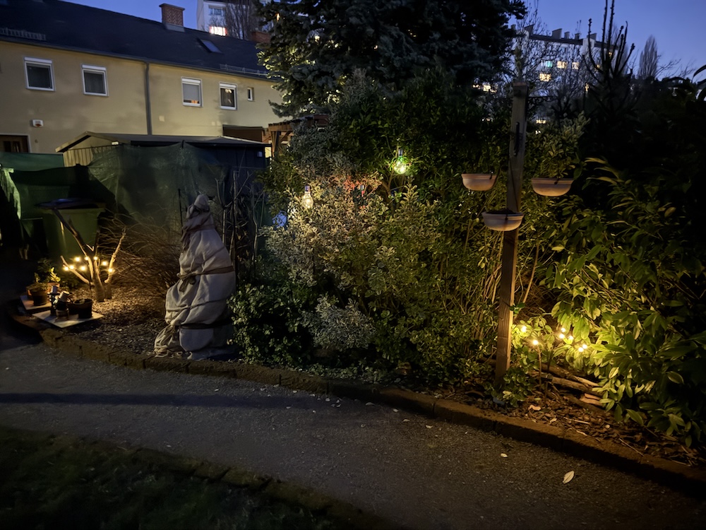 Ein paar  Lichter sind teils als Ersatz, teils neu angebracht worden [Bild Nr. 5/05-5/10] und den immer noch sehr geneigten Baum beim Insektenhotel haben wir komplett zurückgeschnitten, falls er wieder austreibt werden wir in als Strauch wachsen lassen. [Bild Nr. 5/11-5/12]