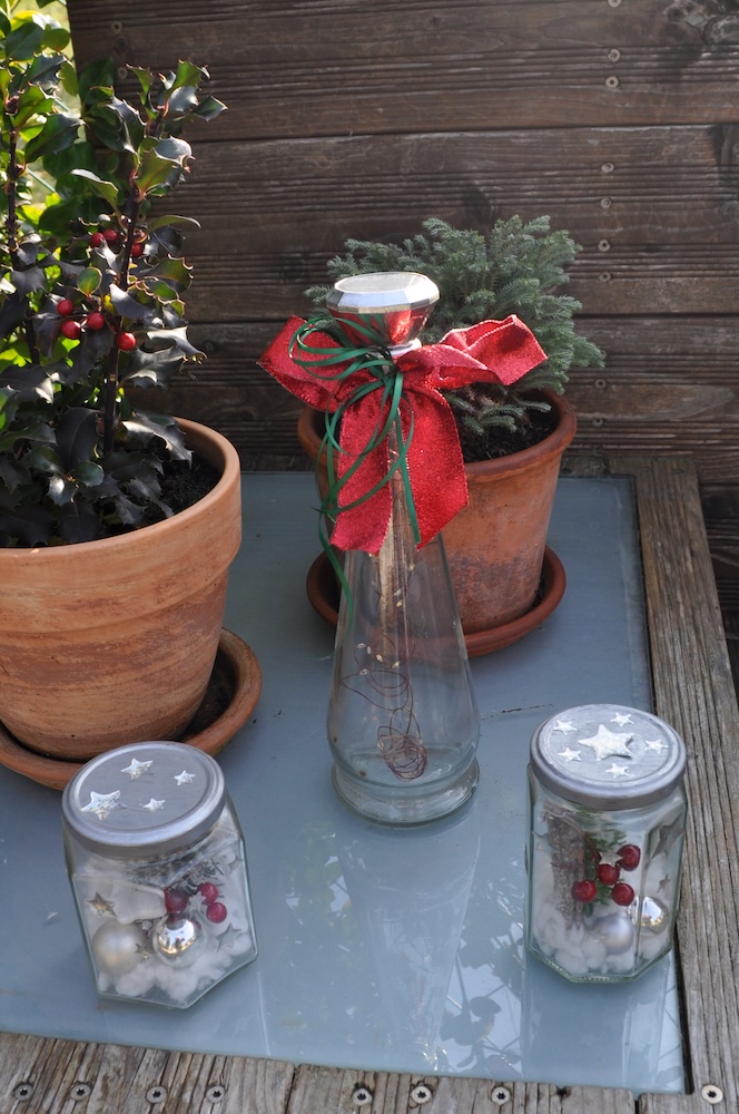 Die meisten der Gläser mit Licht oder Bänder sind selbst gemacht – Fläschchen und Einmachgläser die einfach zu schade sind, um im Altglas zu landen.