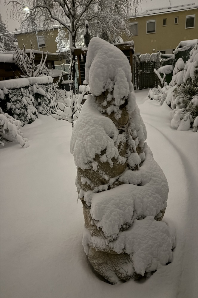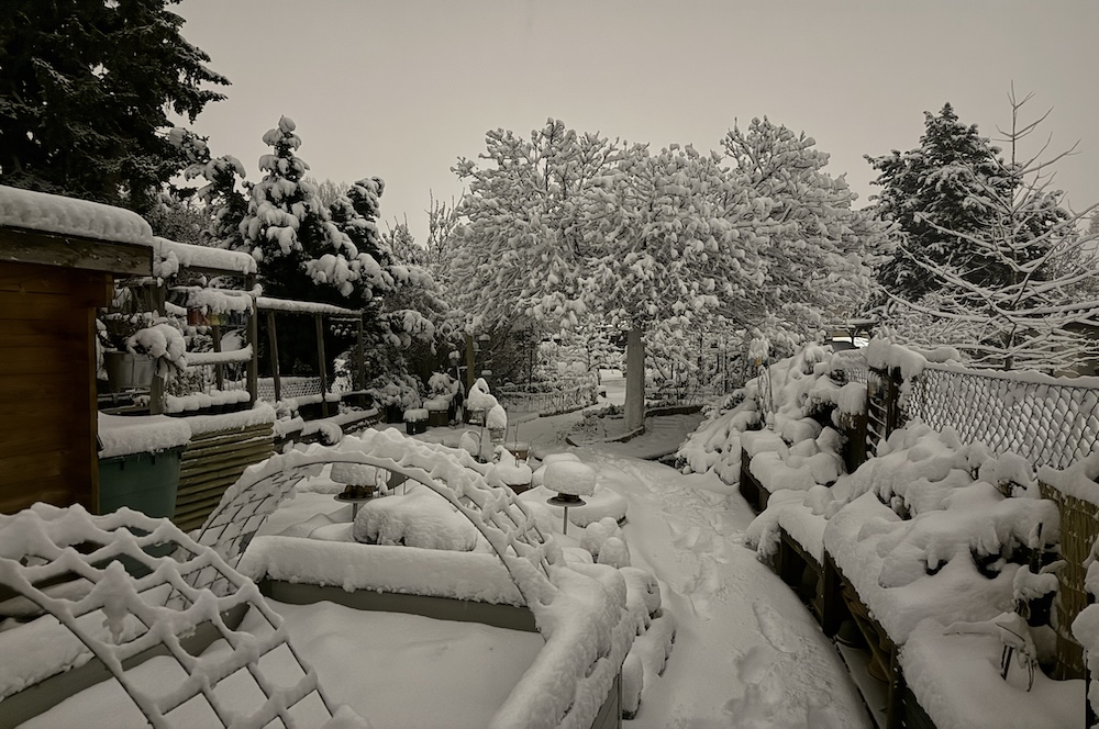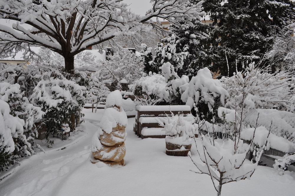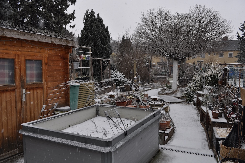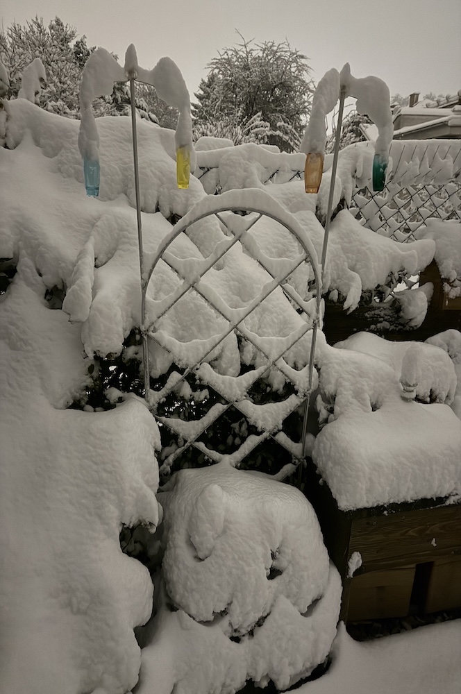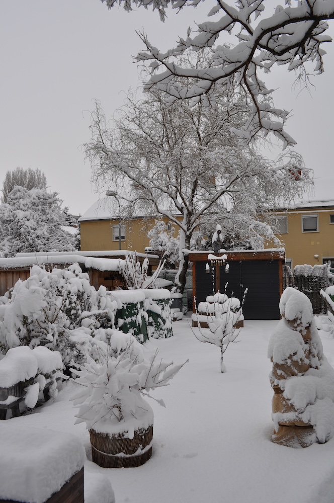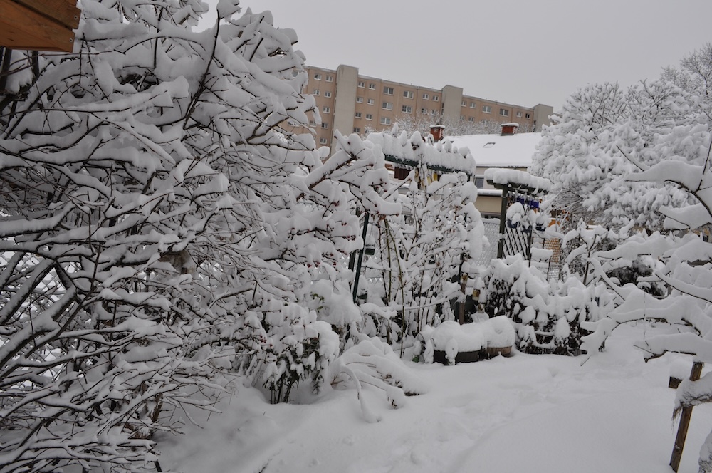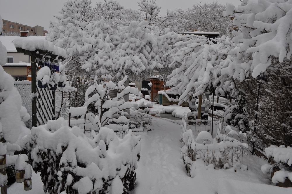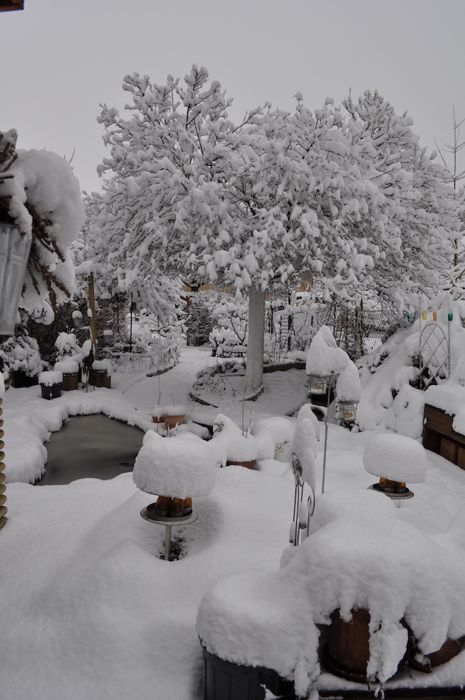 Die ganze Nacht lang hat es durch geschneit [Bild Nr. 5/01-5/18], erst am frühen Vormittag hat der Schneefall geendet und den Garten unter einer dicken Schneedecke vergraben. [Bild Nr. 5/19-5/30]