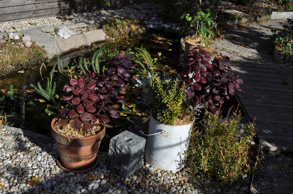 Die Pflanzen welche zuvor dort gestanden haben, sind vorüber gehend um den Teich platziert worden. [Bild Nr. 3/05-3/08] – Für das erste neue Pflanzgefäß haben wir noch etwas von der Strohmatte platziert und eine der Planzen vom Teich ins Beet übersiedelt. – Der Myrthestrauch im schwarzen Kübel ist zu den Twin Bottichen gewandert.[Bild Nr. 3/09-3/12]