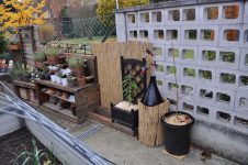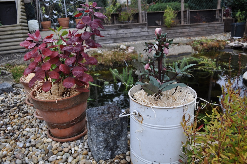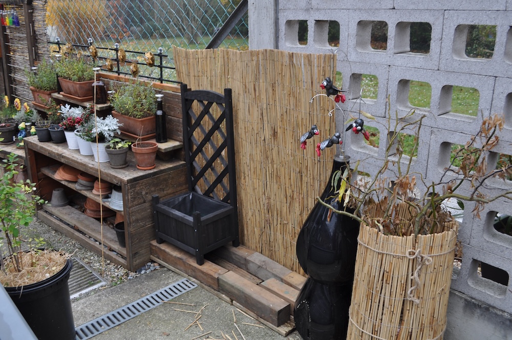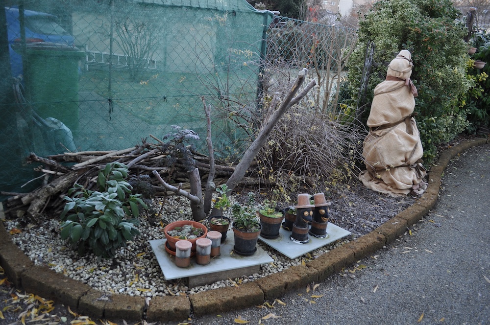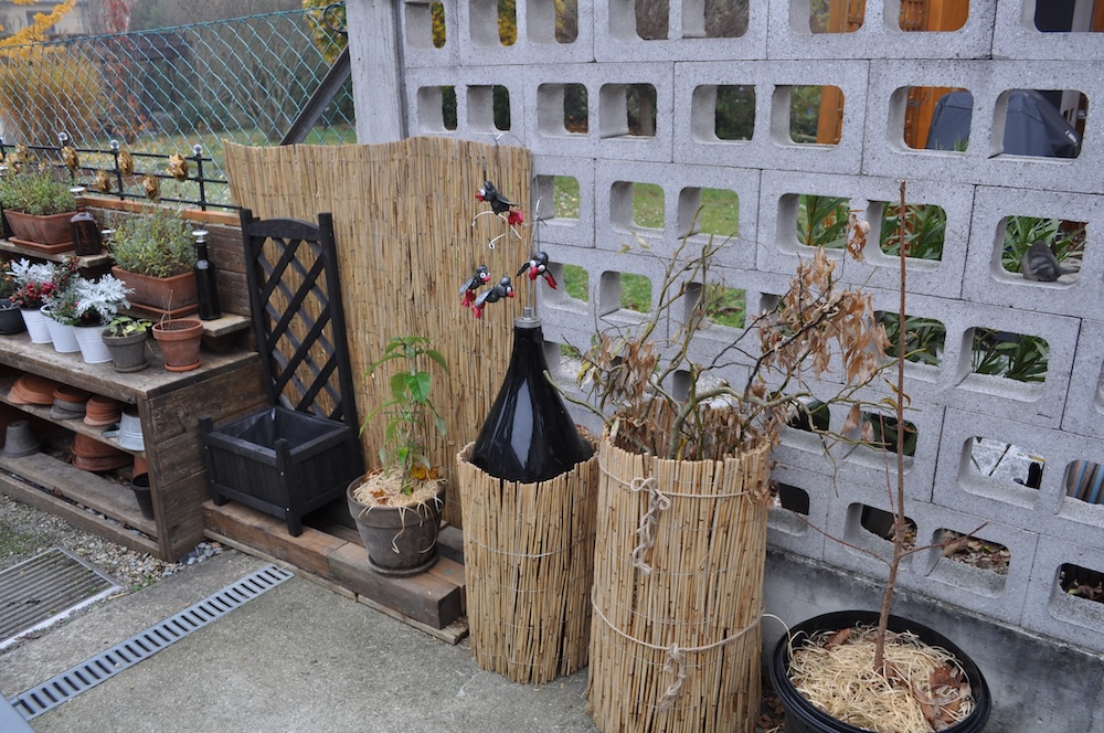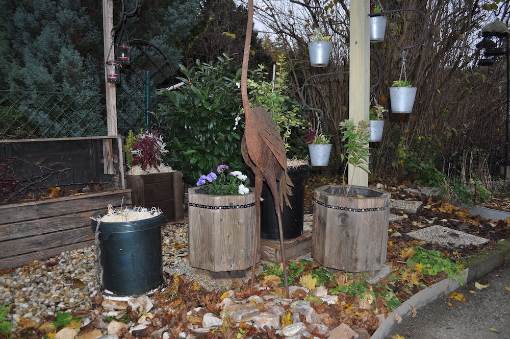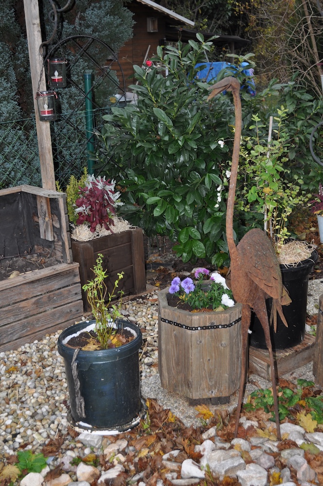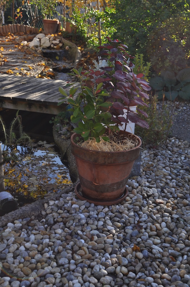 Zu guter Letzt haben wir bei den Töpfen der Korkenzieherweide auch noch eine Strohmatte angebracht, denTopf mit dem großen Korkenzieherweide Ableger haben wir nach hinten gebracht und die Topffiguren wurden zum Überwintern ins Gartengerätehaus geholt. [Bild Nr. 3/28-3/30]
