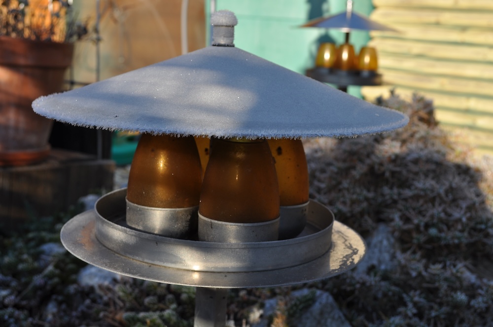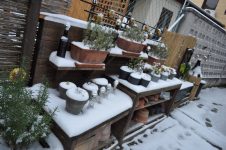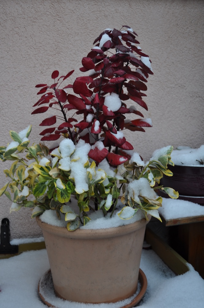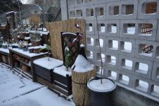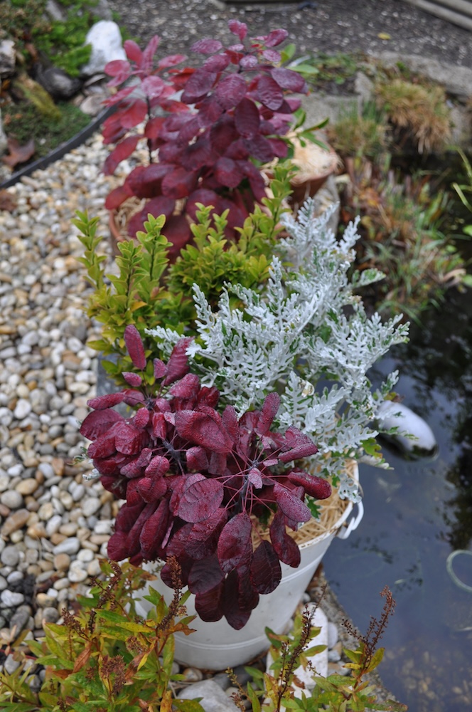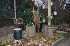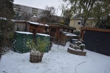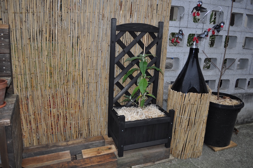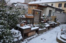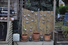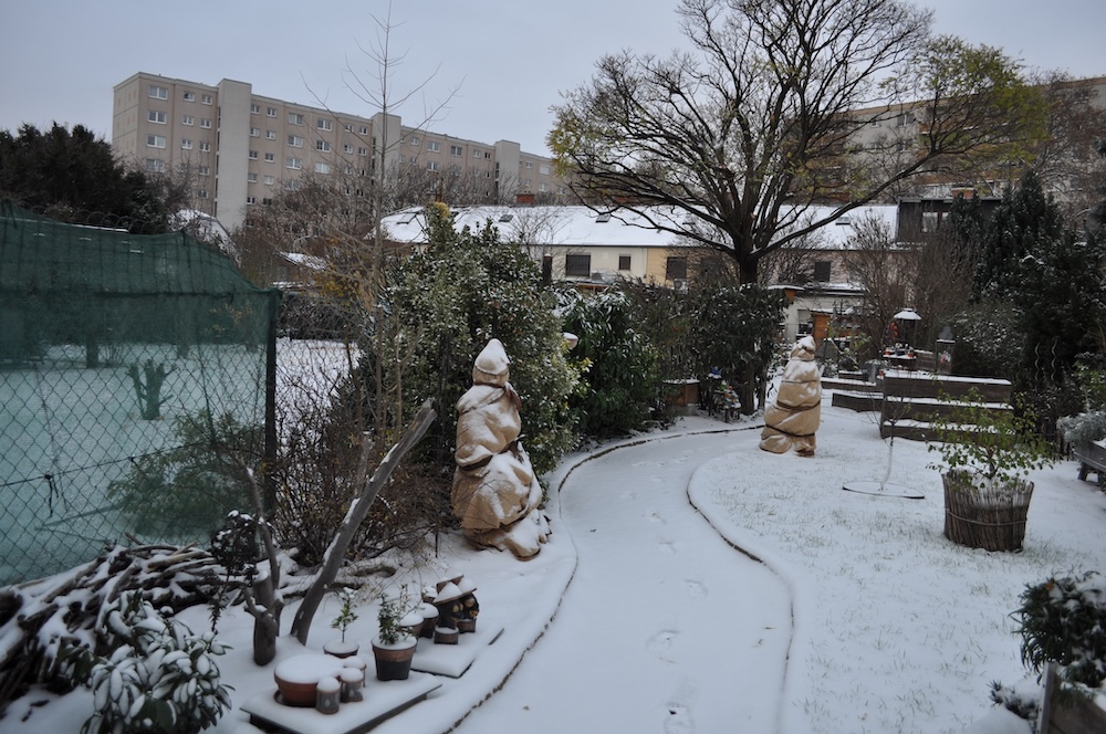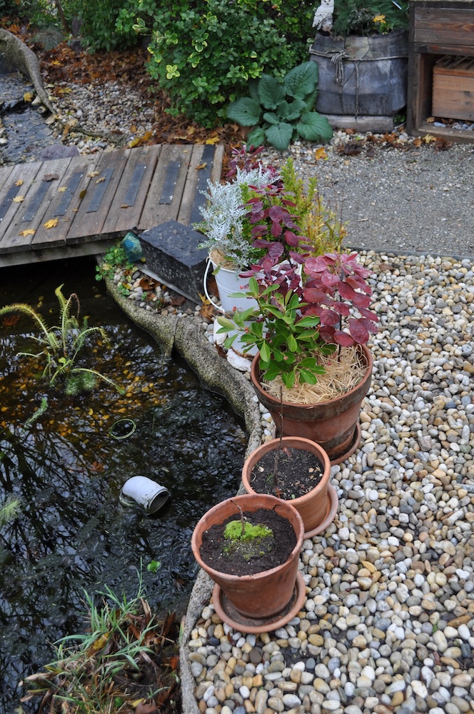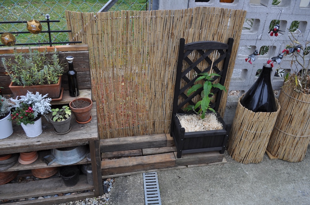 Zu guter Letzt haben wir bei den Töpfen der Korkenzieherweide auch noch eine Strohmatte angebracht, denTopf mit dem großen Korkenzieherweide Ableger haben wir nach hinten gebracht und die Topffiguren wurden zum Überwintern ins Gartengerätehaus geholt. [Bild Nr. 3/28-3/30]