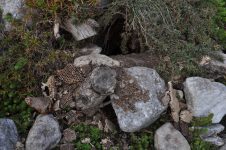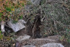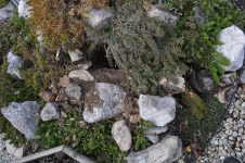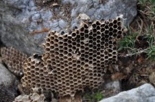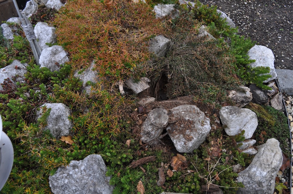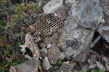 Nachdem die Marder schon zuvor einmal versucht haben das Wespennest am Steinhügel auszuheben – ist es ihnen nun gelungen. – Das entstandene Loch haben wir mit Steinen versperrt. [Bild Nr. 6/01-6/09]
