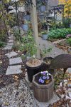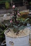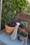 Damit war das große Umpflanzen eröffnet: Die Pflanzen aus dem weißen Kübel sind in den neuen Bottich gekommen. [Bild Nr. 3/18-3/21] In den weißen Kübel ist die Schneerose übersiedelt, [Bild Nr. 3/22-3/24] als Ersatz für diese haben wir die weiße Knospenheide genommen und in ihren Topf sind die beiden kleinen Silberblattpflanzen gewandert. [Bild Nr. 3/25-3/27]