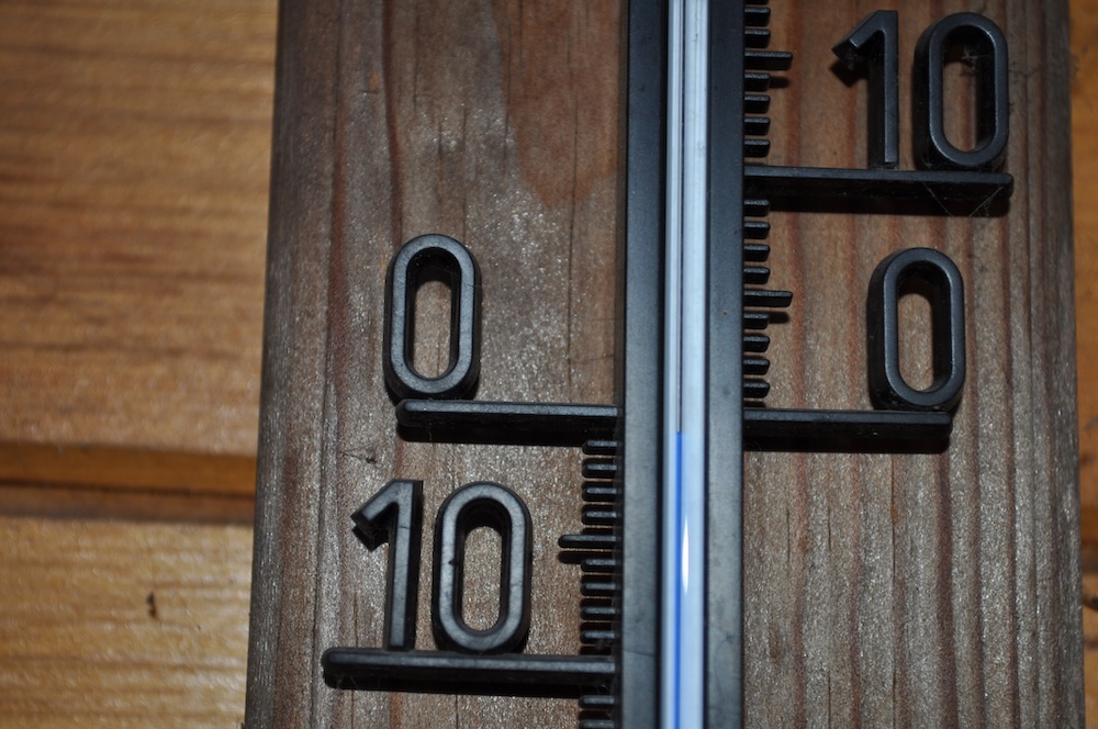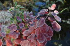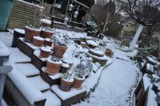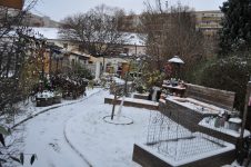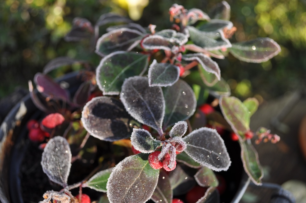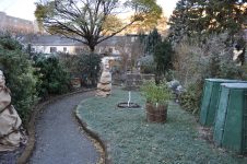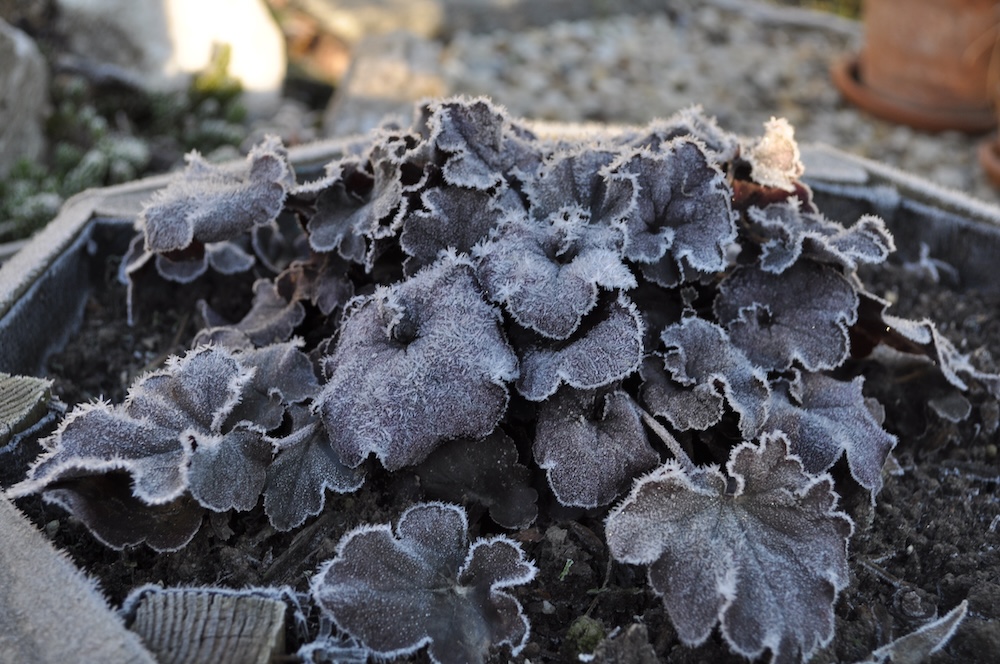 Durch den nächtlichen Frost war der Garten am Morgen wie angezuckert. [Bild Nr. 5/02-5/21] Das kalte Wetter hat den Nebel vertrieben und Platz für die Sonne gemacht – warm angezogen kann im Garten gearbeitet werden.